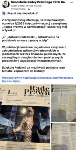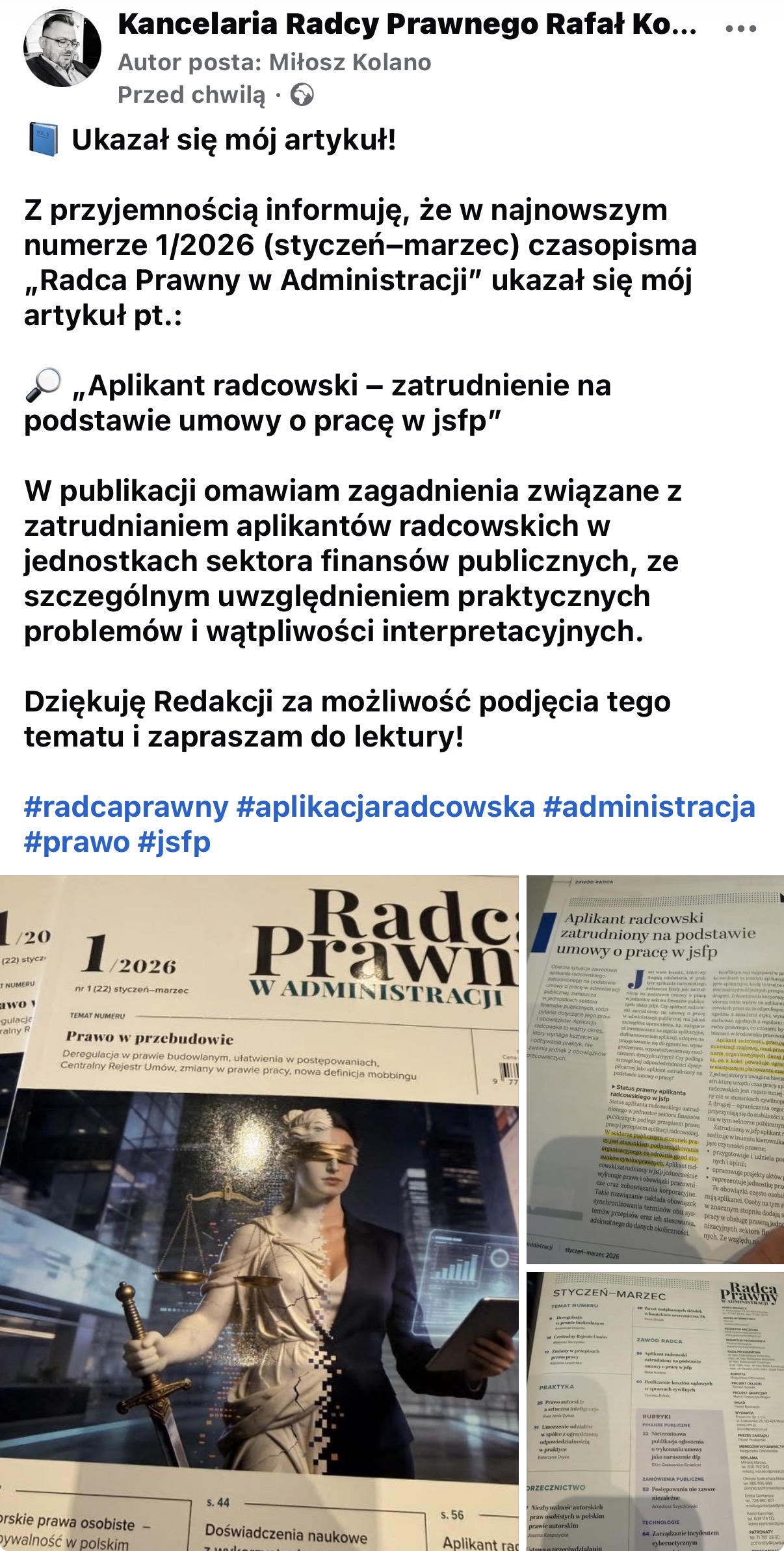 Z przyjemnością informuję, że w najnowszym numerze 1/2026 (styczeń–marzec) czasopisma „Radca Prawny w Administracji” ukazał się mój artykuł pt.: